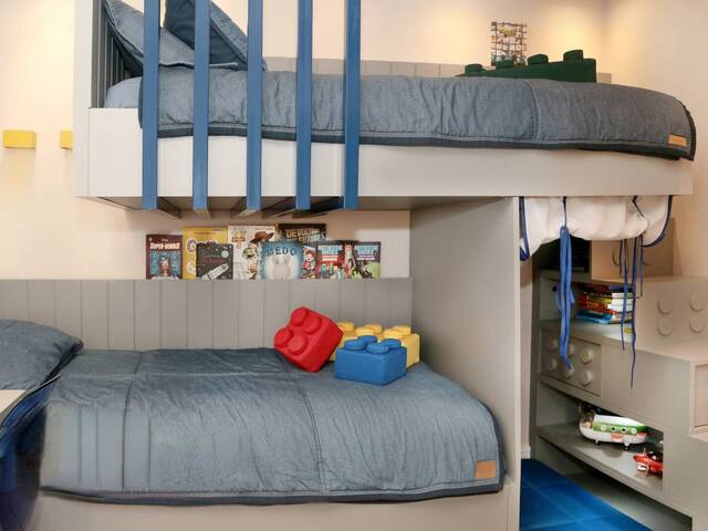 Suíte crianças: closet para 2 crianças, roupeiro, home office para 2 pessoas, 3 camas.
